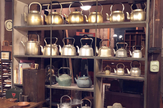日本の古道具や雑貨がところ狭しと並べられ、秘密基地のような印象の店内。