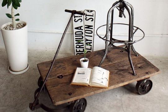 「トロリー」とも呼ばれているこちらは、荷物を引いて運ぶために工場で使われていたものです。