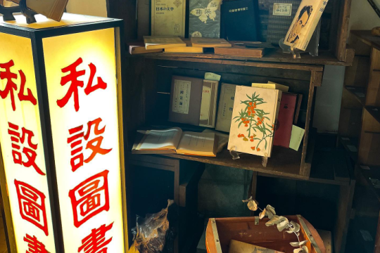 「私設図書館」と書かれた灯篭と、色褪せた表紙が良い雰囲気ですね。