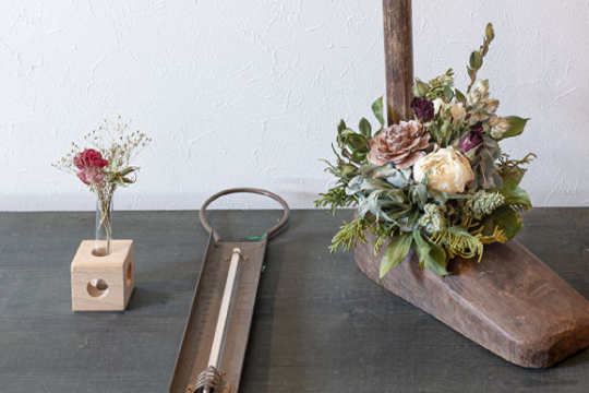 古道具を本来の使い方とは違う角度で捉え、ドライフラワーと組み合わせ飾ることで新鮮さが生まれています。