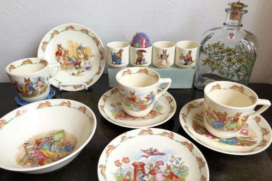 うさぎの家族が描かれた食器セットは、50~70年代に作られたイギリスの老舗陶磁器ブランド「ロイヤルドルトン」のもの。