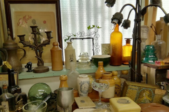 ガラス・陶器のビン、ろうそく立て、食器やカメラなど雑多に並べられたアンティークは、どれもひっそりと自分の出番を待っているような気配がします。