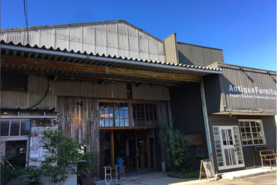 ファクトリーサービスは古びたトタンづくりの町工場を改装して、その半分をカフェのようなモダンな建物と合わせた不思議な形のアンティークショップです。