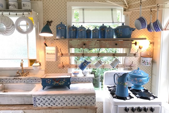 キッチン雑貨やガーデニング用品を中心としたアンティーク品が見事にディスプレイされ、ヨーロッパの田舎の庶民の生活を映し出しているようです。