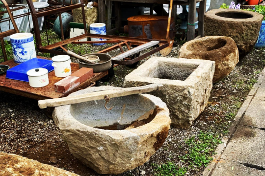店内だけでなく、庭先にも趣のあるアイテムたちが広がります。