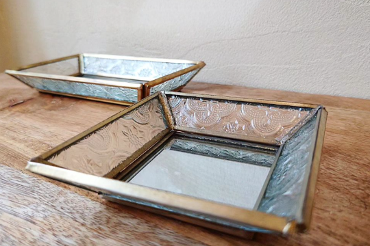 アンティークゴールドの縁取りと、模様が入ったガラスのトレーは、大正ロマンを感じさせます。