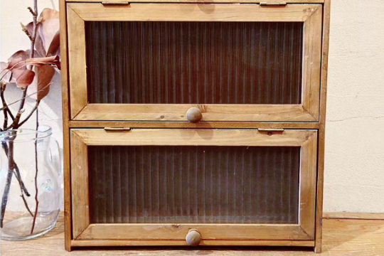 お店でも特に人気のアンティーク調のキャビネット。波板のガラスが、雰囲気を出しています。シンプルなデザインなので。シーンを選ばずに取り入れられそう。