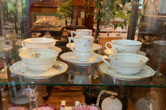 ガラスのショーケースには美しいコーヒーカップが。上品なデザインは、アンティーク好きの心をくすぐります。