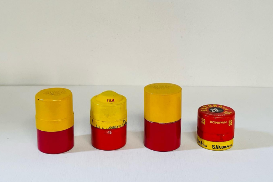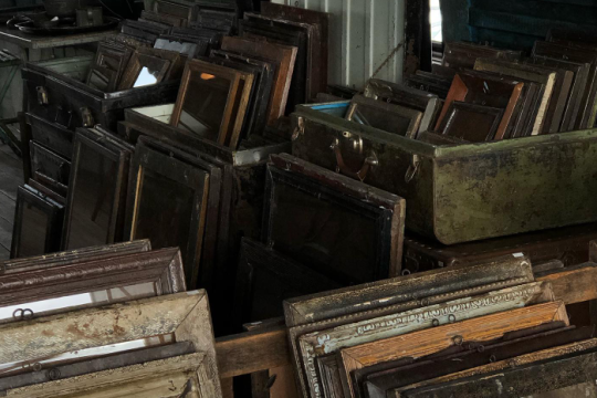 書類棚や公衆電話、木枠のガラスケースに入ったランタンやカメラ。
