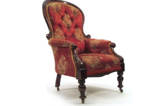 ヴィクトリアンスタイルのアームチェアは、ファブリックの高貴な柄が優雅な気分にしてくれます。