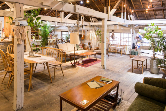 木々に囲まれた緑豊かな場所で、生活雑貨、アパレル、ヴィンテージ家具を扱っていて、ライフスタイルをトータルで提案しています。