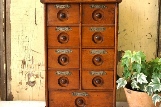 チェストや木箱のほか、キッチンツールやガラス容器、窓枠や額縁、金属のパーツなど、味わいのあるアイテムが多数取り揃えられていますよ。