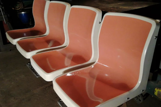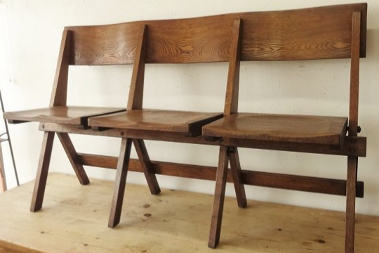 マーブルカラーがかわいい4連の椅子は、ボーリング場で使われていたものだそう。