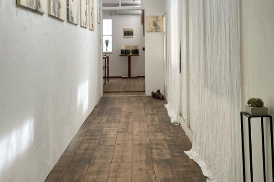 ギャラリーの廊下の白い空間は、ゆったりとした時間や、想像にふける時間をもたらしてくれるかのよう。