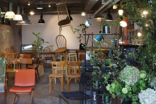 古めかしい家具や雑貨とみずみずしい植物たち。外からはやわらかい光が差し、生命力あふれる空間になっています。