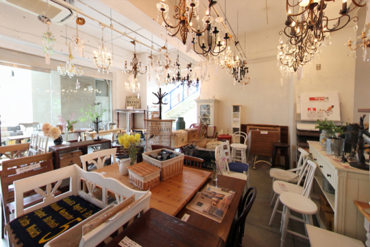 ワンフロアの広い店内へ足を踏み入れると、所狭しとシャンデリアや色々なテイストの家具が並んでいます。
