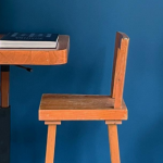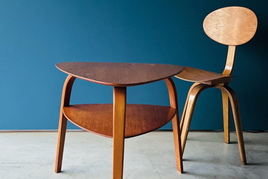 丸みを帯びた三角形の天板がモダンなサイドテーブルと椅子は、Steiner(シュタイナー)社の1950年代のお品。