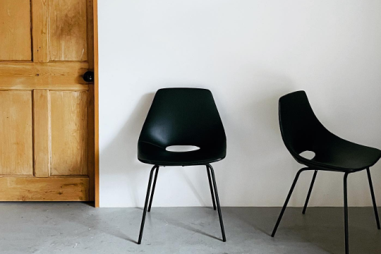 白い壁に影絵のように浮かび上がるフェイクレザー貼りのアムステルダムチェアー。