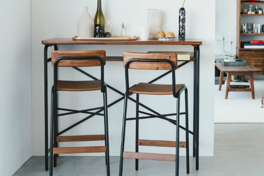 アカシア材をふんだんに使用し、アイアンの脚部を用いてシャープにまとめたデザインのカウンターテーブル&チェアは、SWELLA(スウェラ)シリーズのもの。