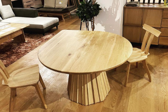 北海道旭川でつくられた「しずく」と名付けられたダイニングテーブルは、貴重な楢材を使用した人気アイテム。
