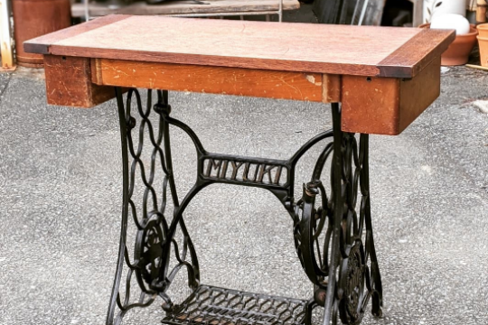 アンティークミシンの脚を修理・リメイクしたテーブルも雰囲気があって素敵です。