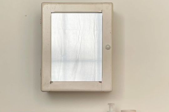 取っ手を開けば収納スペースが現れる壁掛けキャビネットは、扉に鏡がついた珍しいデザイン。