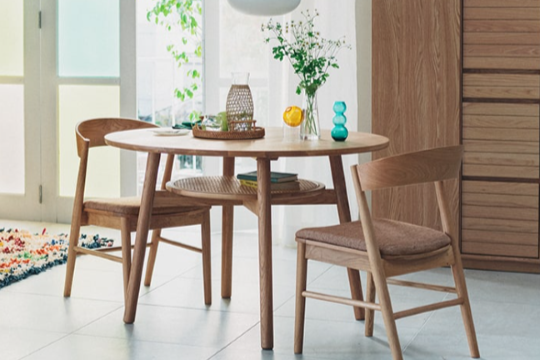 ナチュラルな木目とラタンの異素材の組み合わさったダイニングセットは、円形の天板と丸みのある脚部で優しい印象に。