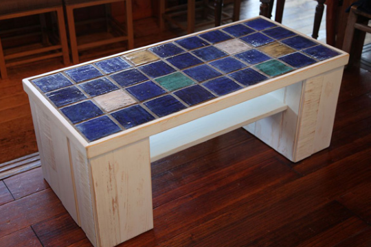 タイル張りがユニークで可愛いローテーブルは、地中海の色をイメージしたそう。