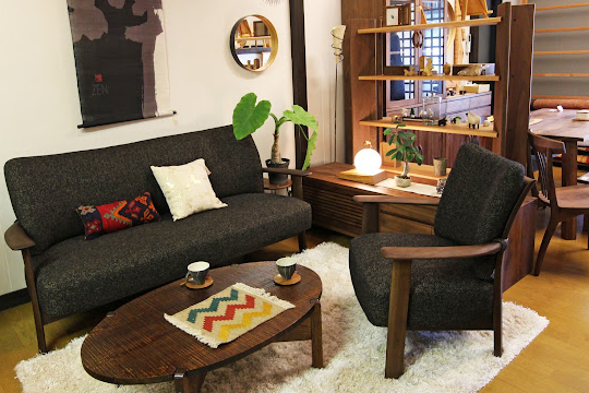 個性的なテーブルに国産名ブランドのソファやチェアが気持ちよくマッチしていて、セットで購入したくなるようなディスプレイですよ。一枚板、無垢材がお好きな方はぜひ足を運んでみてくださいね。