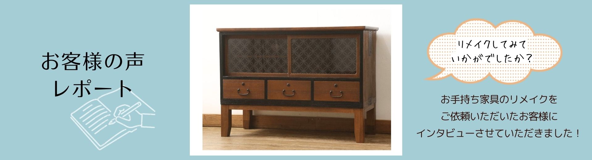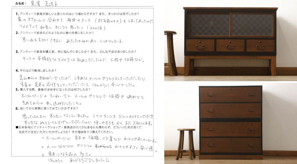 黒澤様、この度は大切なご祖母様の桐箪笥のリメイクを当店にお任せくださり、誠にありがとうございました。末永くご愛用いただけますと幸いです。ご依頼いただきましたこと、当店一同心よりお礼申し上げます。