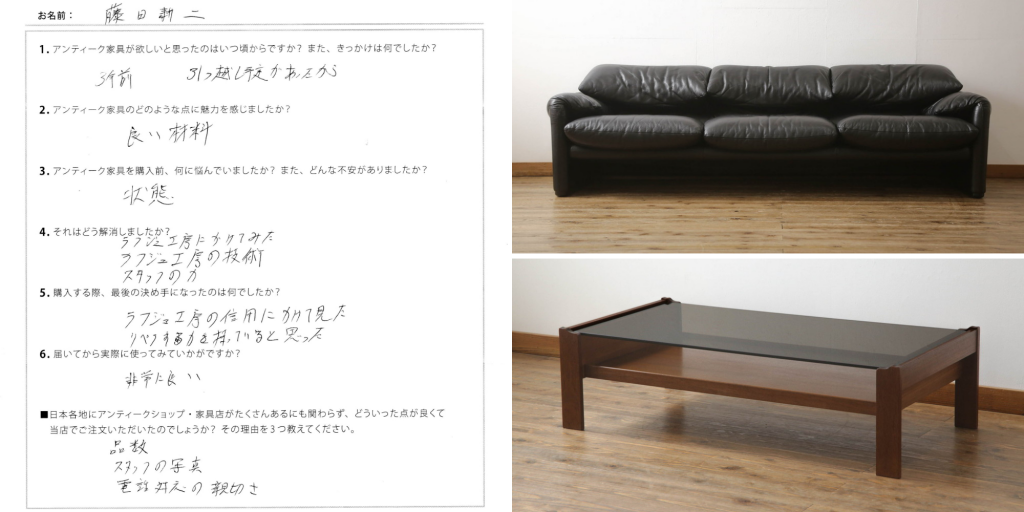 藤田様はソファをご購入していただいた数か月後、ローテーブルをお探しとのことで再び当店をお尋ねくださいました。またご一緒に家具選びができますこと、うれしく思います。お選びいただいた2点、末永くご愛用いただければ幸いです。