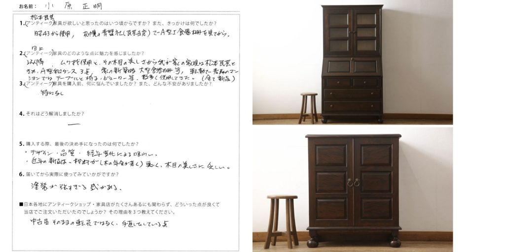 小原様は、その後も松本民芸家具をお探しの際、ラフジュ工房をご利用くださいました。リピートしてくださり、誠にありがとうございます。重ねてお礼申し上げます。