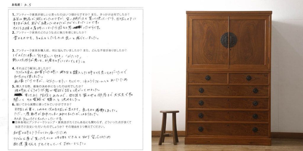 【お客様のレビュー】神奈川県 K.S様 和箪笥ご購入「昔のものでもちゃんとしたものは良いと感じていました」