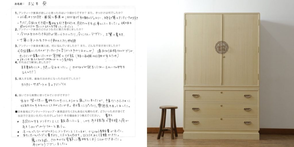 松本様、この度は当店をご利用くださり、誠にありがとうございました。長らく箪笥を探されていたとのことで、さぞかしご苦労だったかと思います。当店のサービスや商品を評価していただき、誠にうれしい気持ちでいっぱいです。