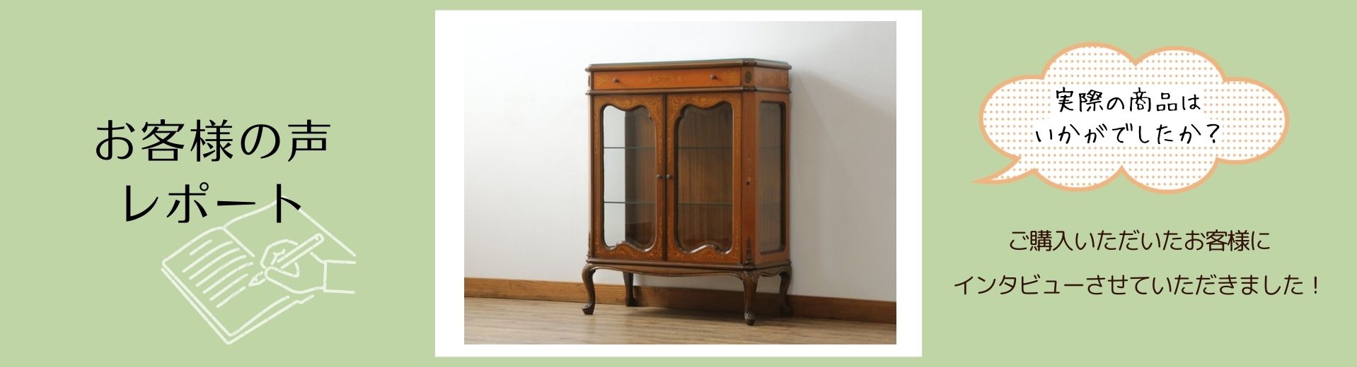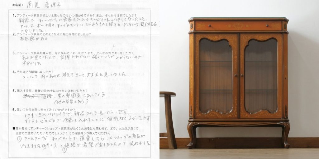 南尾様、この度は当店をご利用いただきまして、誠にありがとうございました。新しいお住まいで、お気に入りのティーセットとキャビネットで優雅なひと時をお楽しみいただければと思います。そして末永くご愛用いただければ幸いです。