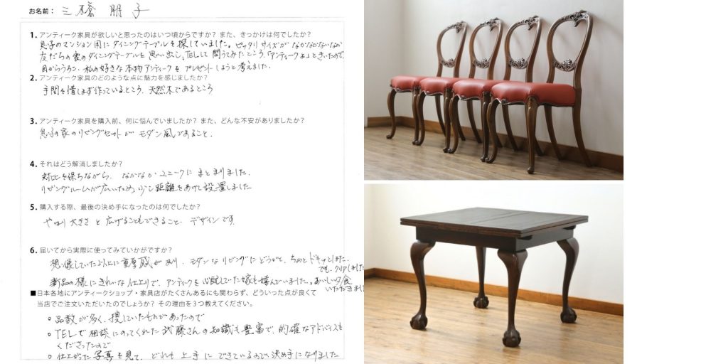 今回、三橋様がご購入されたのは、イギリスアンティークのドローリーフテーブルとダイニングチェアの4脚セット。