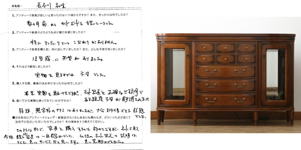 サイドボードをお探しだったという長谷川様。当店にてこちらの商品を見つけてくださいました。なんと一目惚れだったそうで、購入を決意。気に入ったサイドボードと出合えたようで、当店としてもうれしい気持ちでいっぱいです!
