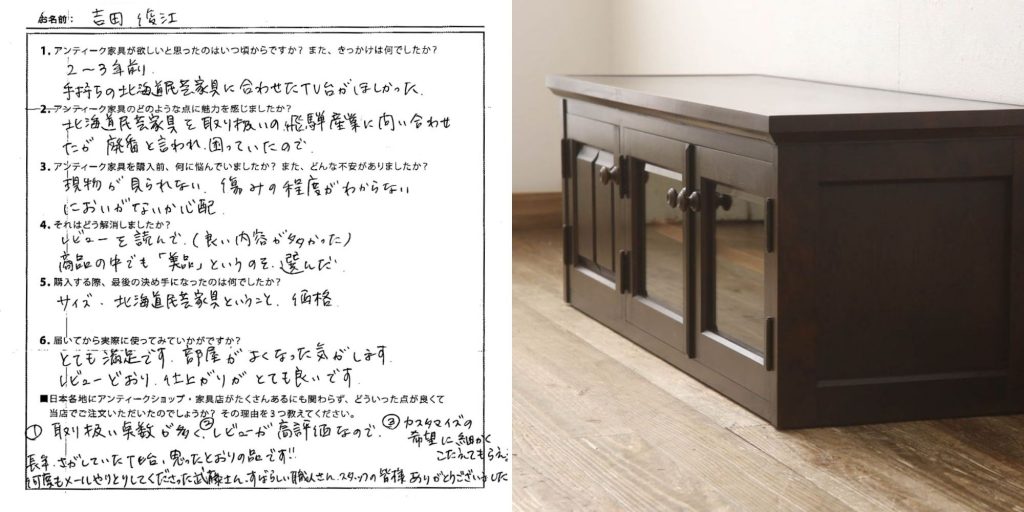 吉田様、この度は当店をご利用いただきまして、誠にありがとうございました。ようやく出合えた念願の北海道民芸家具のテレビ台、末永くご愛用いただければ幸いです。