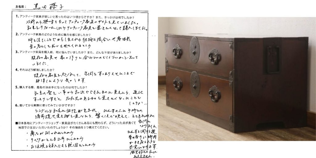 以前から興味を持ってアンティーク家具のサイトを見ていました。和室をリフォームしたら、アンティーク家具を置きたくなって購入しました。