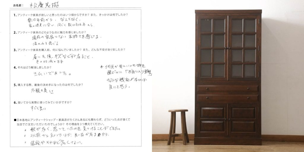 松廣様、この度は当店をご利用いただきまして、誠にありがとうございました。とっておきの食器棚、末永くご愛用いただければ幸いです。
