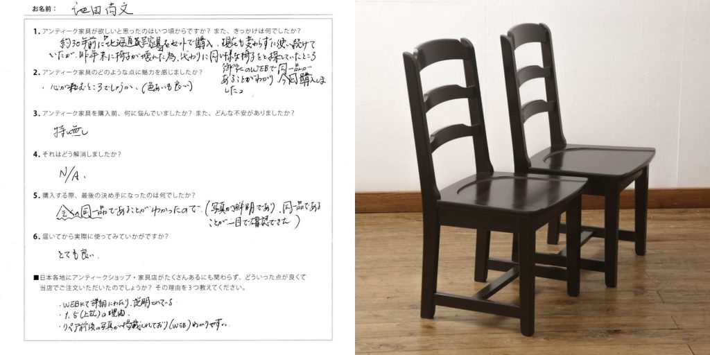 池田様は、30年以上も愛用されていた北海道民芸家具の同じチェアを探し、当店にたどり着かれたとのこと。こうしてまた同じ商品とめぐり合えてうれしく思います。