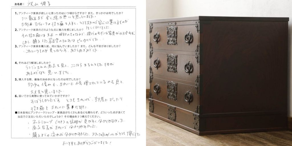 この度は、当店にて岩谷堂箪笥をお迎えいただき、誠にありがとうございます。アンケートのご協力も心から感謝申し上げます。