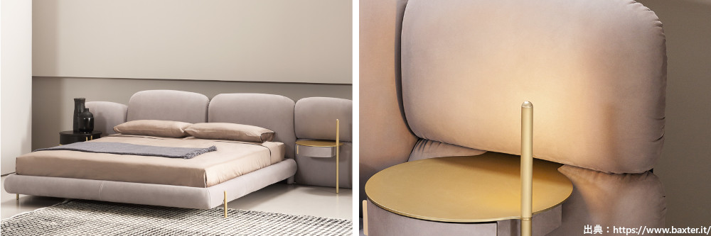 同じくイタリアの高級家具ブランドであるバクスターのベッドフレームも見ていきましょう。バクスターは上質なレザーを使用した家具のデザインを得意分野としています。様々な技法で加工し、姿形を変えていくレザーの様子がまさにバクスターの魔法と言われる所以です。