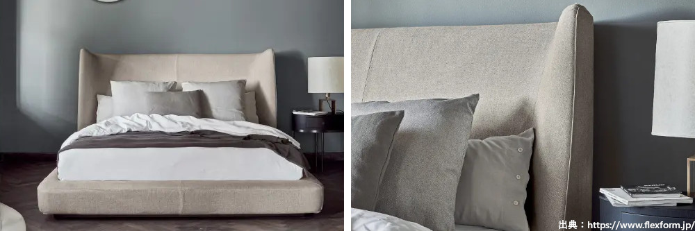 フレックスフォルムのベッドフレームも、フレックスフォルムのポリシーに則ったデザインになっています。それはどんな時代でもエレガントであり、機能性に優れているということです。例えば、ヘッドボードに付けられた張地は取り外し可能なものが多くメンテナンスしやすい特徴があることや、予め収納を設けたベッドフレームなど、使った時に便利な機能が設けられています。そして機能面が優れているだけではなく、いつ見ても美しく優雅なルックスをしています。ヘッドボードやベース部分にクッション性のあるデザインを採用しているものが多く、使用したときの包み込まれる使い心地も魅力的ですよ。