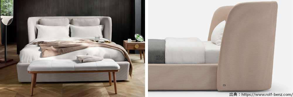 ロルフベンツのベッドフレームは、どれもリラックス感のあるデザインのものばかり。ヘッドボードとは別にクッションを用意したデザインのものが特徴的で、ベッドとお揃いのクッションを置けるのが嬉しいですね。ベッドフレームの種類はそう多くはありませんが、選べる張地のレパートリーが非常に多く、ファブリックとレザーの種類は合わせて約300種類ほどあるから驚きです。これだけ種類があれば、きっと自分らしいコーディネートが楽しめることでしょう。