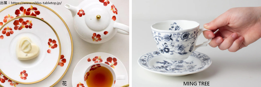 その中でもニッコーの食器は今も人気のあるカテゴリーです。世界一白いと認定されたボーンチャイナの食器を販売しているので、白さにこだわりのある方にもおすすめですよ。注目のシリーズは、花シリーズ。鮮やかな赤が目を惹く花柄模様で、白い食器とのコントラストが美しいデザインです。この花模様は、一つひとつ手描きされているのだそう。とても手が込んでいます。MING TREE(ミングトゥリー)シリーズは1957年にデザインされたもの。それをニッコーのボーンチャイナで復元しています。ティーカップとソーサーのセットの他、プレートが大きさ違いで揃っていますので、ケーキ皿にしても良さそうですね。