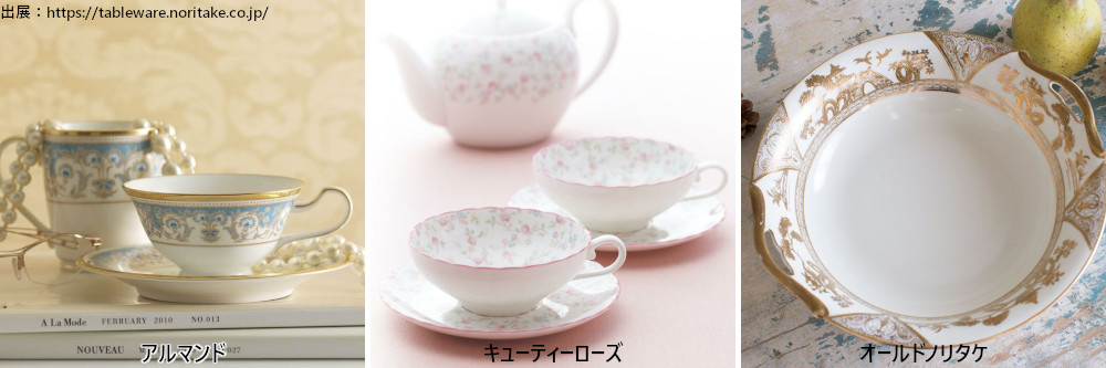 ノリタケの食器のレパートリーは、ティーカップやティーポット、コーヒーカップ、マグカップなどのティーセットの他、お皿、サラダボウル、ケーキ皿など実に様々です。特に人気のコレクションには錦織をイメージしたアルマンド、花柄が愛らしいキューティーローズなどがあります。また、戦前アメリカを中心に輸出されていたノリタケの食器はオールドノリタケと呼ばれ、アンティーク品として非常に価値が高いものになっていますよ。