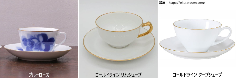 また、ゴールドラインシリーズも人気です。大倉陶園の美しい白い陶器にゴールドのラインを引いたシンプルながら印象的なシリーズです。ゴールドラインにはリムシェープとクープシェープの2種類があり、リムシェープは持ち手やカップの下部にカーブをつけているのに対し、クープシェープは凹凸の少ないすっきりとしたシンプルな形状をしているという違いがあります。