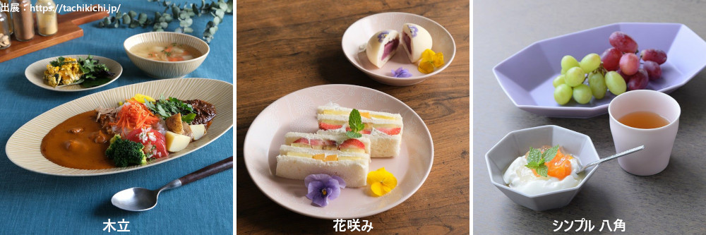 そんなたち吉が作り出す洋食器は、洋食器ながら和の雰囲気も兼ねたものばかりです。例えば、木立シリーズは、放射状の筋がスタイリッシュなデザイン。パスタ皿やボウル、ケーキ皿など洋食に対応するラインナップですが、必ずしも洋食ではなく、和食を盛っても美しく映えます。和洋どちらも使えるので、いくつも揃えたくなるシリーズですね。花咲みシリーズは明るいカラーに線画の植物が愛らしい印象。線画は白で描かれているため、目立ちすぎず料理を盛った時もさりげなくきまります。シンプル八角シリーズは、その名の通り八角形の食器です。盛皿も小鉢も八角形になっているのがおもしろいですよね。個性的な形状にニュアンスカラーを乗せておしゃれに仕上がっています。