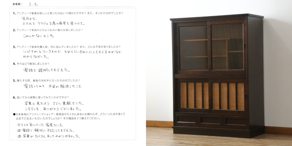 I.S様がアンティーク家具にご興味を持たれたきっかけは、当店のウェブサイトをスマホでご覧いただいたこととのこと。当初リペアに関する不安をお持ちだったものの、当店スタッフとのお電話でのご説明を通じてご安心いただけたようで、うれしい限りです。
